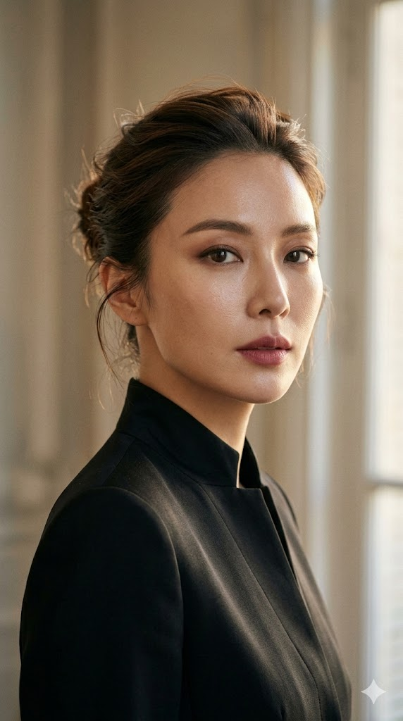 한국인 여성 연예인 스타일, 우아한 번 헤어, 조각 같은 페이스라인, 도드라진 광대와 선명한 턱선, 깊이 있는 눈빛