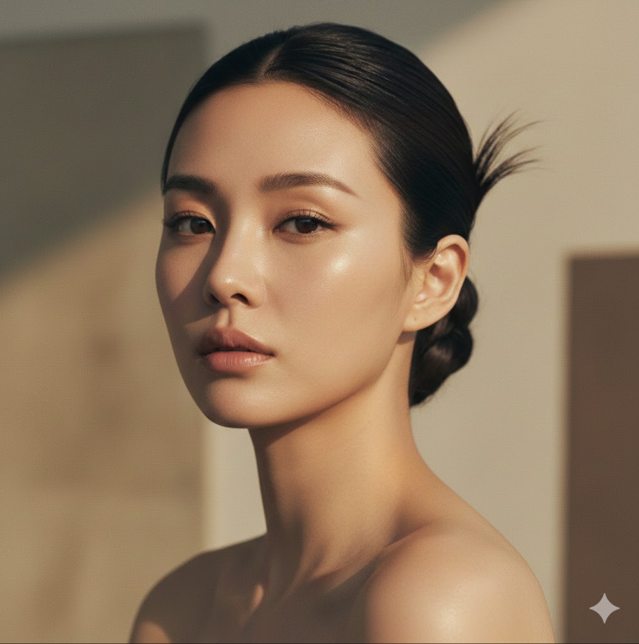 리얼한 피부 질감, 모공까지 살아있는 고해상도 디테일, 은은한 하이라이트, 자연스러운 윤광